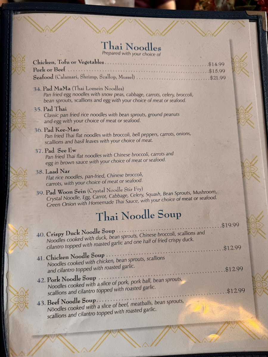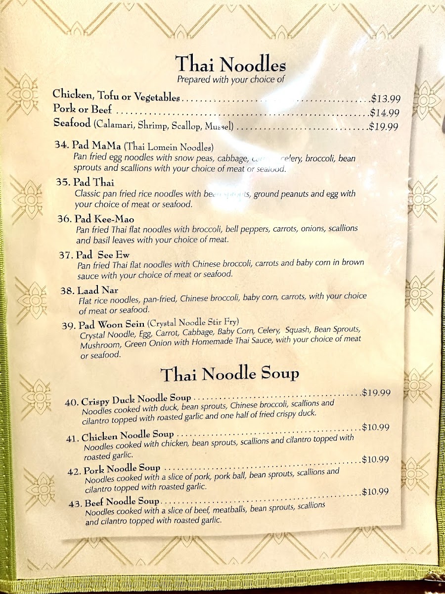 Crystal Noodle, Egg, Carrot, Cabbage, Celery, Squash, Bean Sprouts, Mushroom, Green Onion with Homemade Thai Sauce, with your choice of meat or seafood.