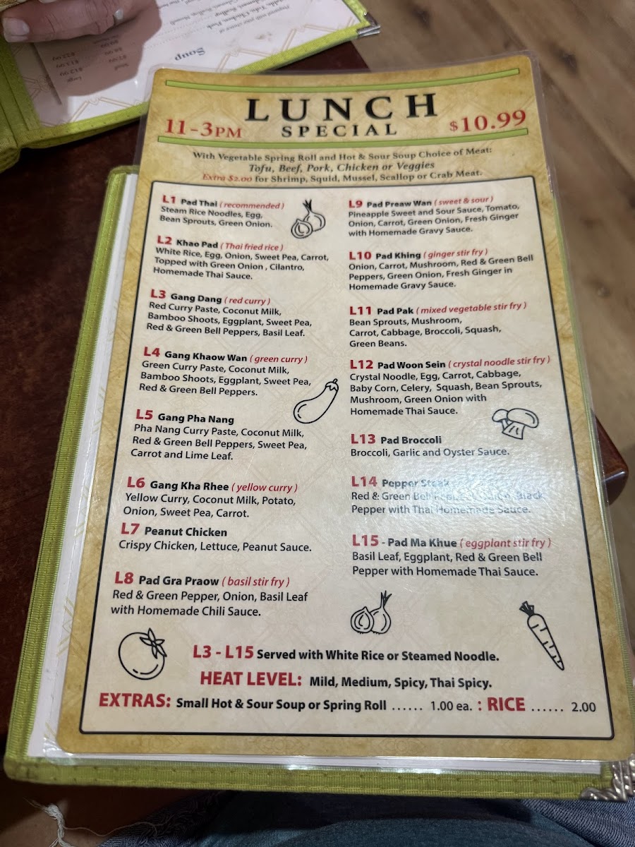 Pan fried Thai flat noodles with broccoli, bell peppers, carrots, onions, scallions and basil leaves with your choice of meat.