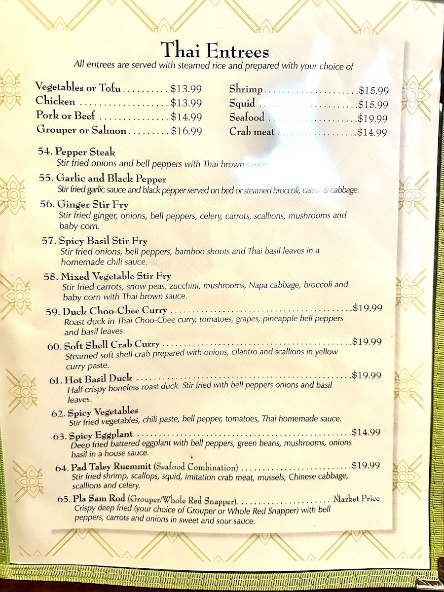 Pan fried choice of meat with chili sauce, peppers, bamboo shoots, galangal, kaffir lime leaves, bell pepper and basil leaves.